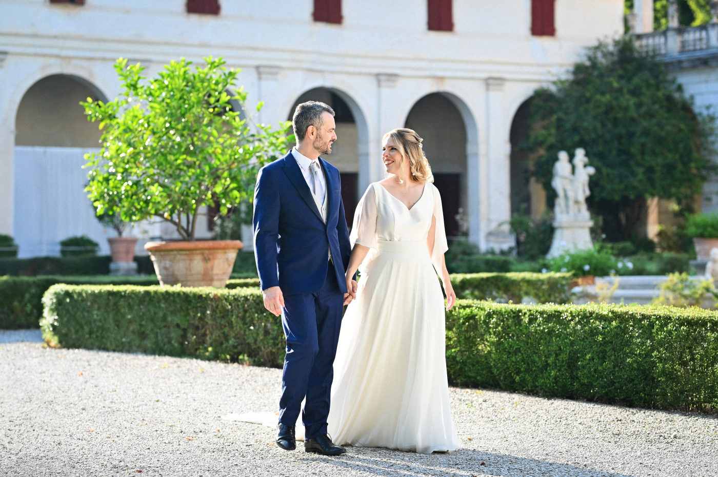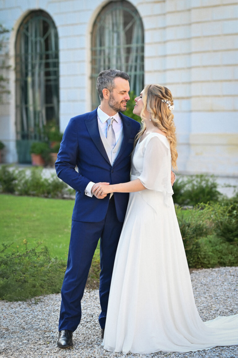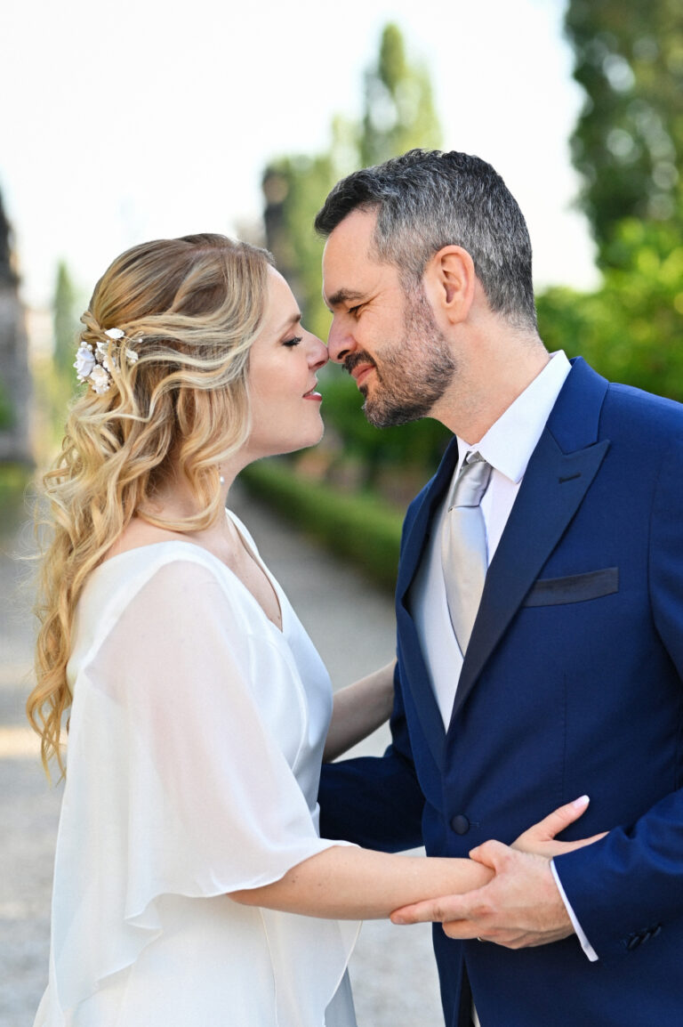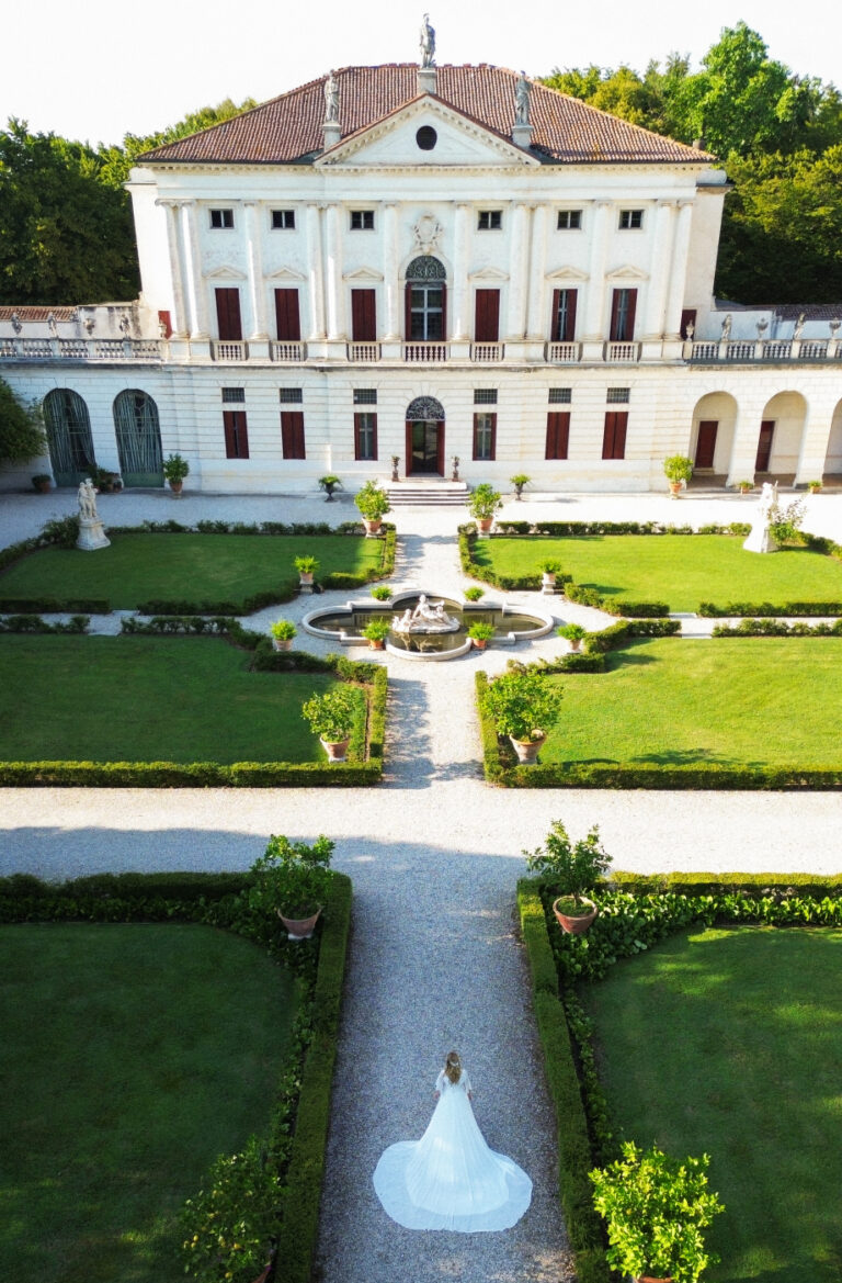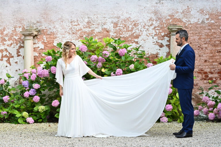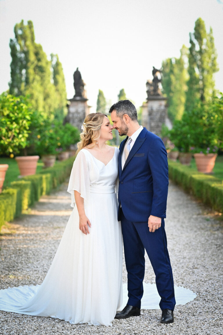 Celebrare le nozze a Villa Ca’ Marcello significa immergersi in un’atmosfera aristocratica. Sara e Gianluigi hanno scelto la maestosità del salone da ballo affrescato per il ricevimento, mentre il rinfresco si è svolto tra i sentieri del vasto parco storico, tra fontane e statue classiche.